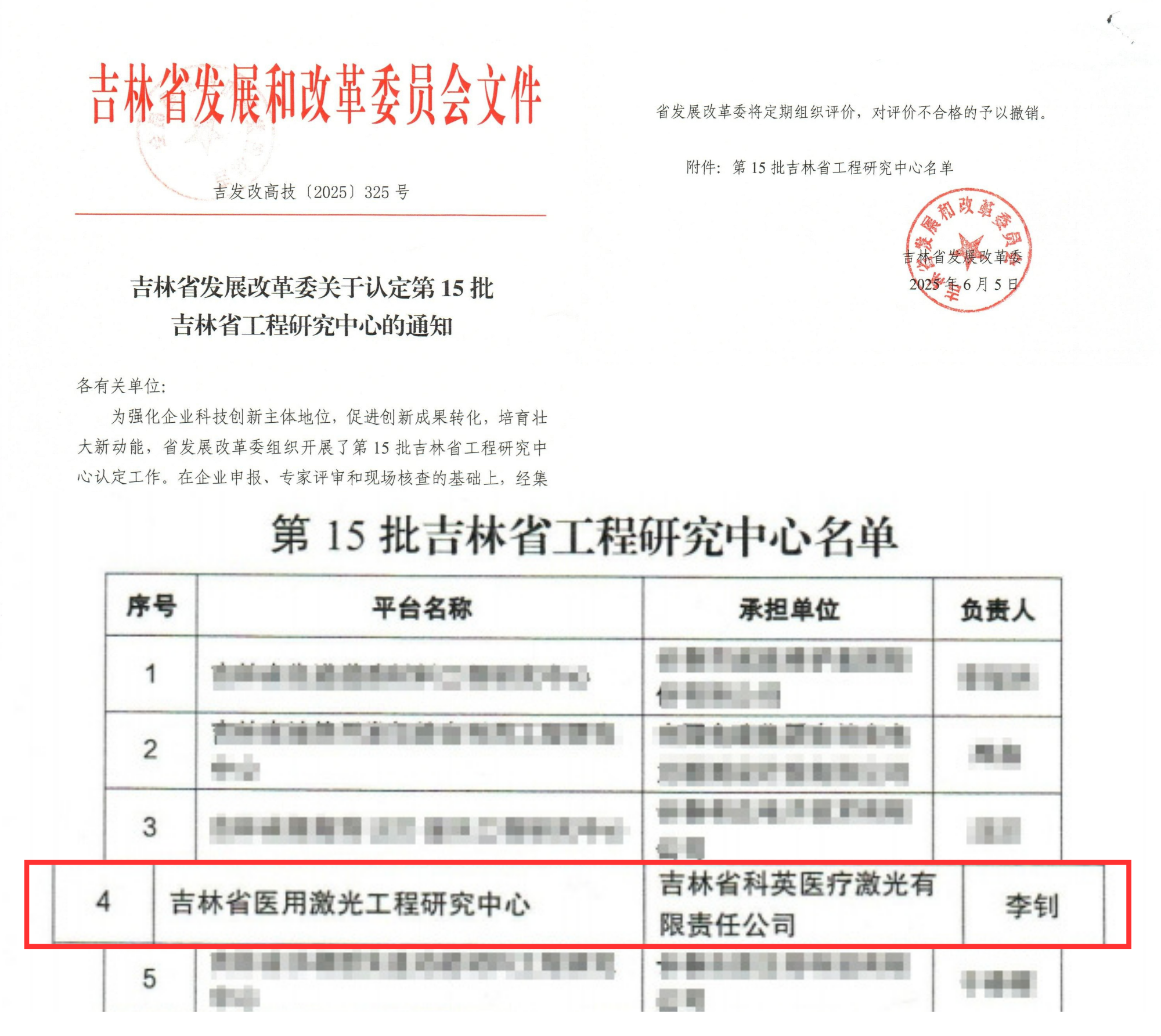 經(jīng)吉林省發(fā)展改革委嚴(yán)格評(píng)審和層層篩選,我公司憑借雄厚的技術(shù)實(shí)力和卓越的創(chuàng)新能力,成功入選第15批吉林省工程研究中心認(rèn)定名單,被正式認(rèn)定為"吉林省醫(yī)用激光工程研究中心"。這一榮譽(yù)的取得,不僅是對(duì)我公司科技創(chuàng)新能力的權(quán)威認(rèn)可,更標(biāo)志著我公司在核心技術(shù)突破、科研成果轉(zhuǎn)化、產(chǎn)學(xué)研協(xié)同創(chuàng)新及科學(xué)運(yùn)營管理體系等方面邁上了新的臺(tái)階,充分彰顯了我公司在行業(yè)內(nèi)的領(lǐng)先地位與核心競(jìng)爭(zhēng)力。